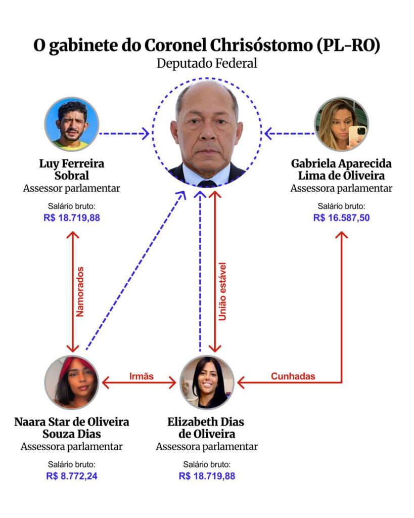 Elizabeth levou a irmã caçula, Naara Star de Oliveira Souza Dias, para o gabinete em julho de 2022. Desde então, a cunhada de Coronel Chrisóstomo, de 25 anos, obteve R$ 386,5 mil em remunerações – com o mais recente valor bruto fixado em R$ 8.772,24. A nomeação ocorreu como Cargo de Natureza Especial (CNE), a função obriga o funcionário a bater ponto na Câmara.