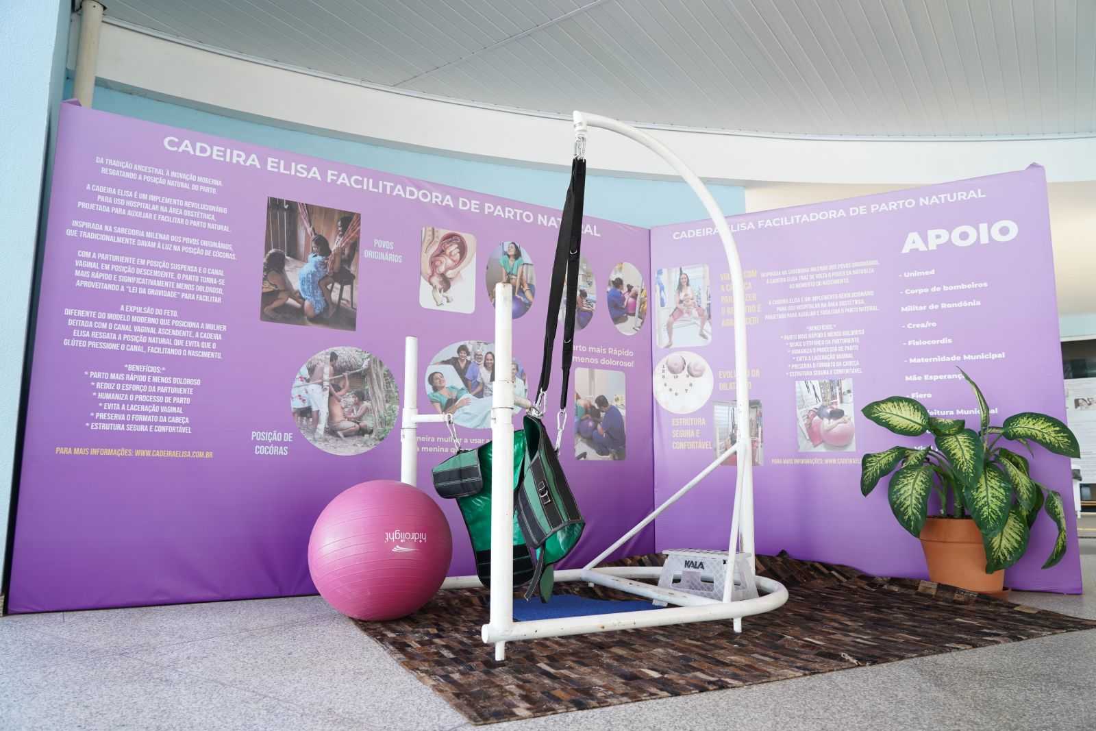 Inspirada em práticas tradicionais de parto entre povos indígenas e comunidades ancestrais — como o uso da posição de cócoras e redes de apoio, a Cadeira Elisa traz um conceito moderno com base em saberes populares. Ela tem patente registrada, suporta até 350 kg e conta com aprovação do Crea e do Corpo de Bombeiros.